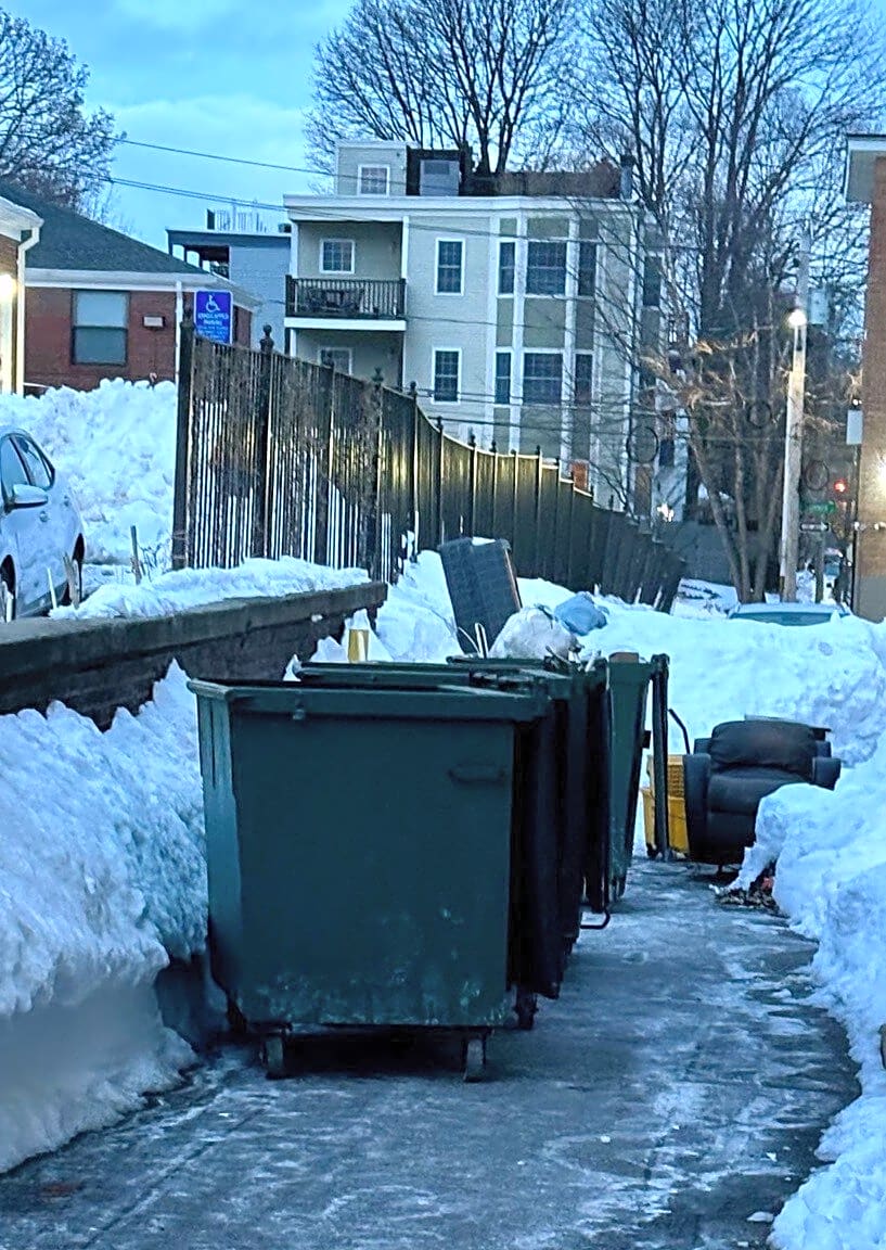 7 Bakersfield St, Dorchester, Ma, 02125Dumpsters are open and uncovered, but empty. (Trash day was yesterday.) Inexplicably, there are plastic bags of trash, along with other debris, piled on the snowbank next to the dumpsters. It is a mess.