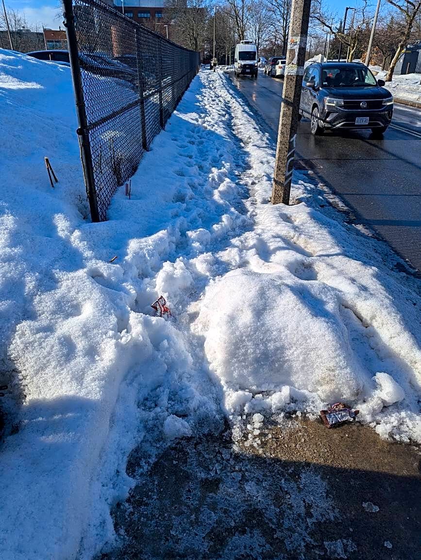 Intersection Of Williams St And Amory St, Jamaica Plain, MaSidewalk still not shoveled. People have to walk on the street