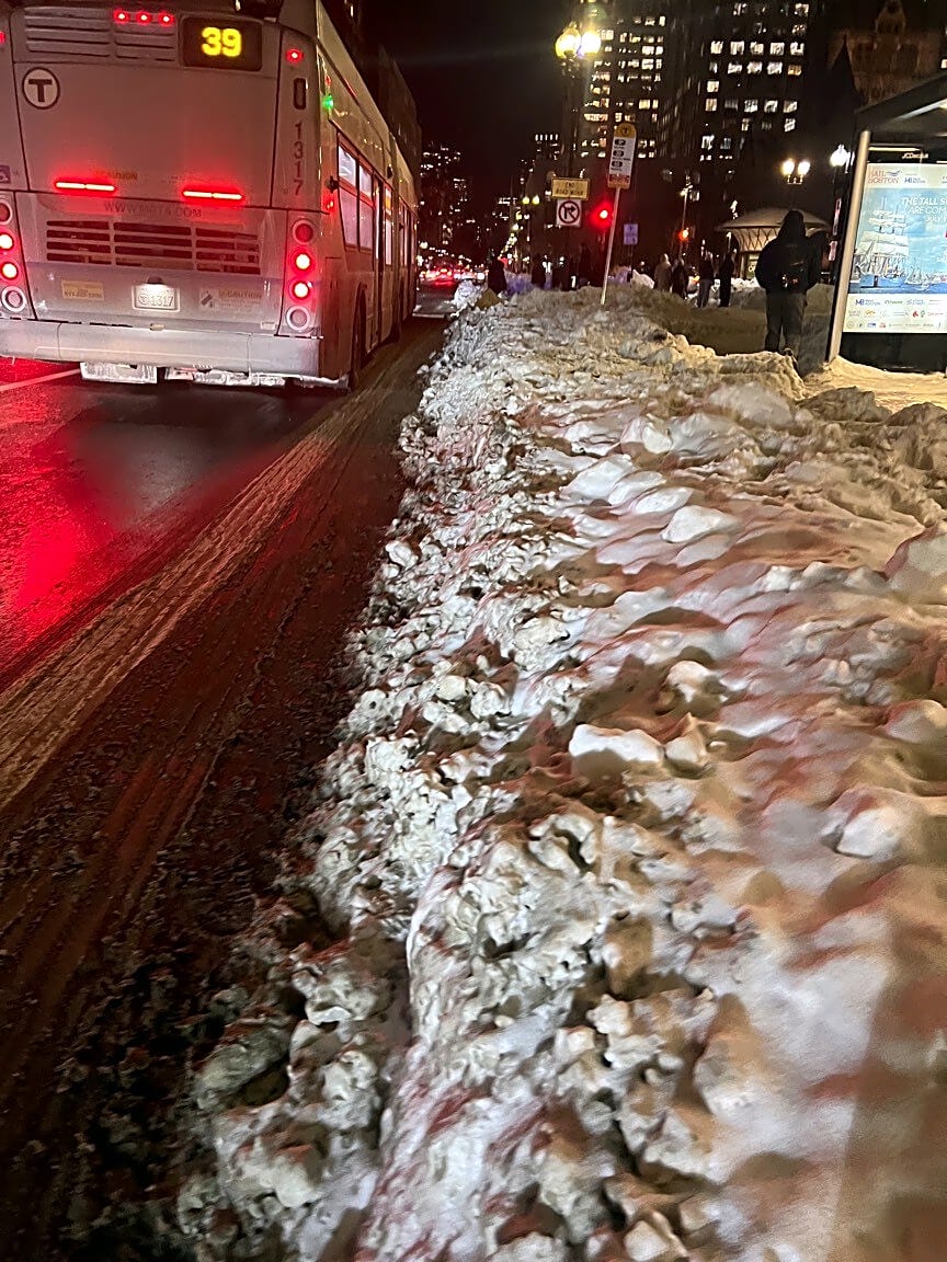 1130 Washington St, Roxbury, Ma, 02118How is there only one cleared out path to get on a bus stop on east Berkeley St/Washington #9,11 buses and Boylston St,939 bus stops snow bank have only cleared a tiny walkway and a bigger cut through paths are needed for commuters in these two areas. Can something be done? Hey@mayorWu should we have to jump over snow banks to be able to catch a bus these days or what?