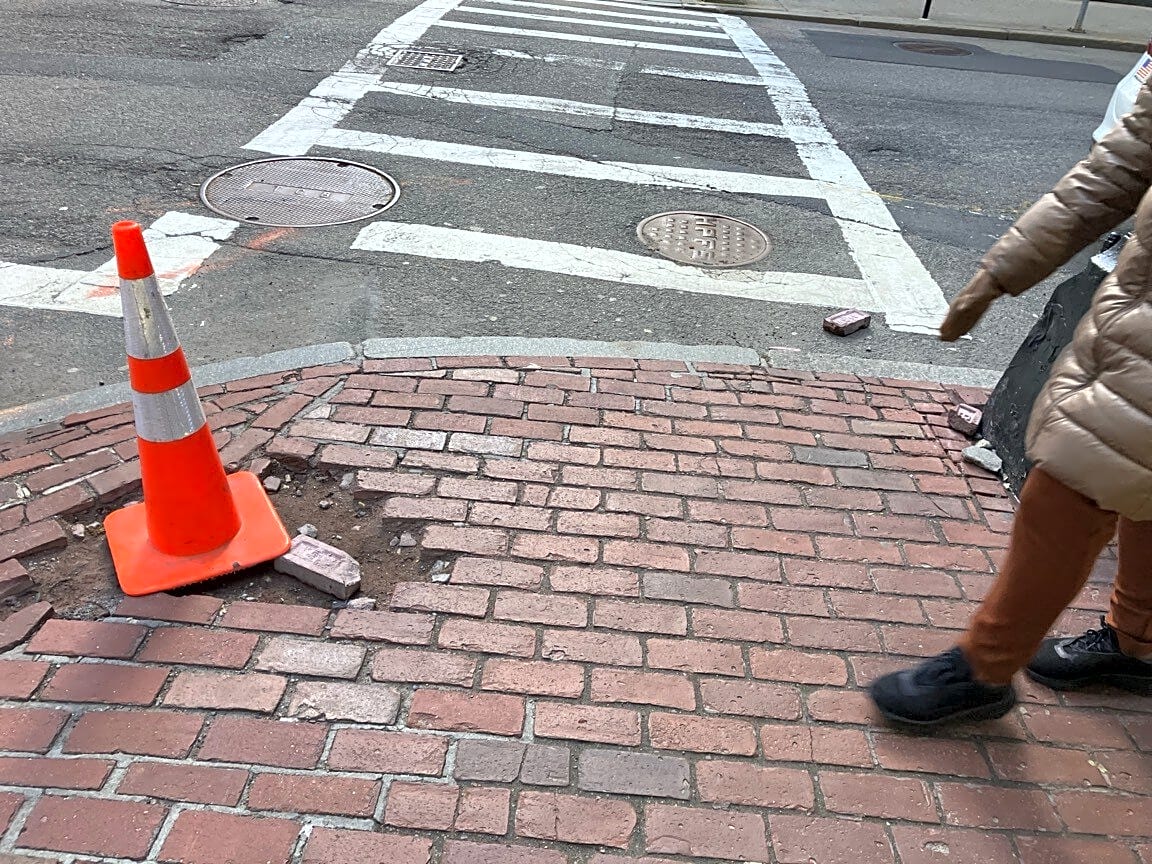 Intersection Of Devonshire St And Water St, Boston, MaPits and strewn bricks at sidewalk entrance to popular T station and busy intersection