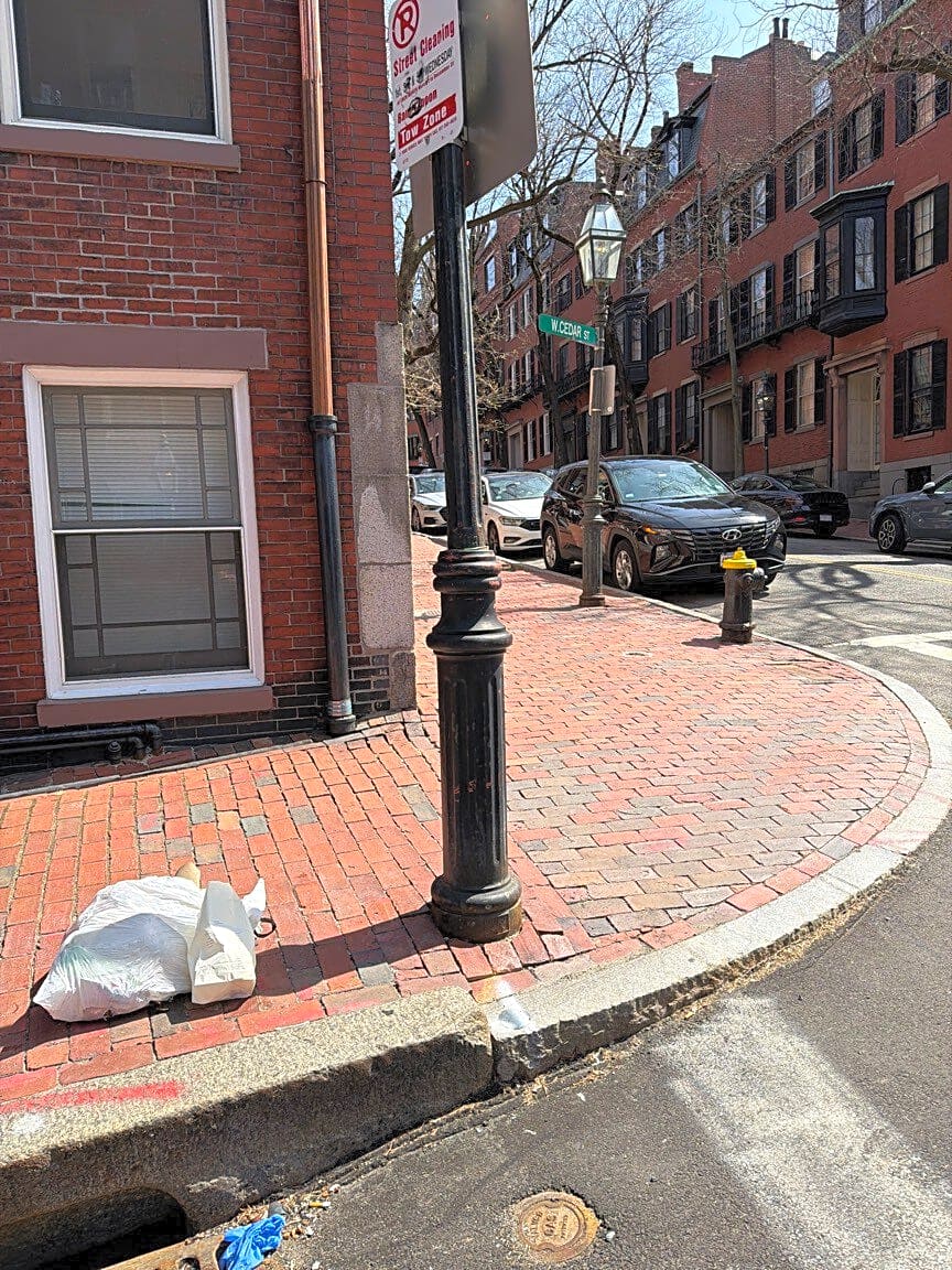 Intersection Of W Cedar St And Mount Vernon St, Boston, MaSame bag still here, since Friday. If you cannot site due to lack of evidence, then get it picked up ahead of schedule. This is hugely unsanitary and in a location with many tourists. Is this what the City of Boston wants to show people?