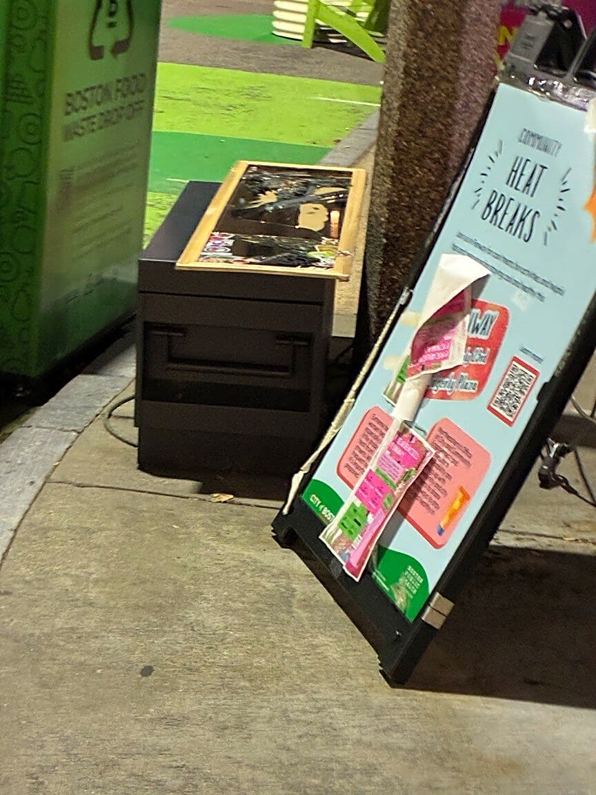 Broken mirror and large cabinet dumped behind city of Boston good water receptacles. This is in front of Whole Foods. Been there for weeks. Thanks.