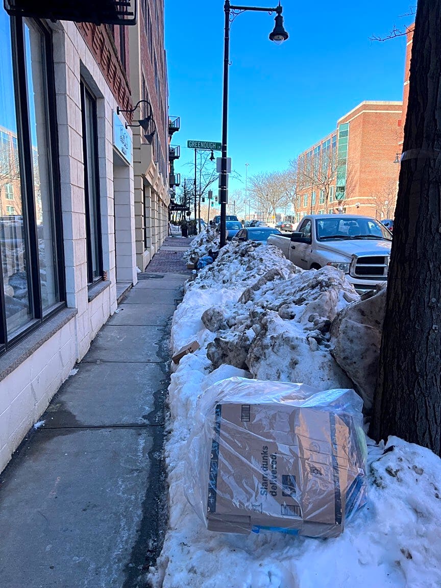 Intersection Of Columbia Rd And Old Harbor St, South Boston, MaNo snow removal 3 weeks after storm public walkway by moakley