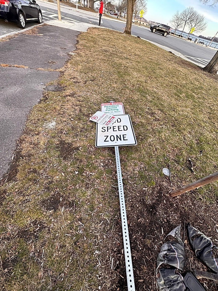 1865 W Columbia Rd, South Boston, Ma, 02127This street sign was knocked down last week. It is located at the corner of Farragut and E 6th Street.