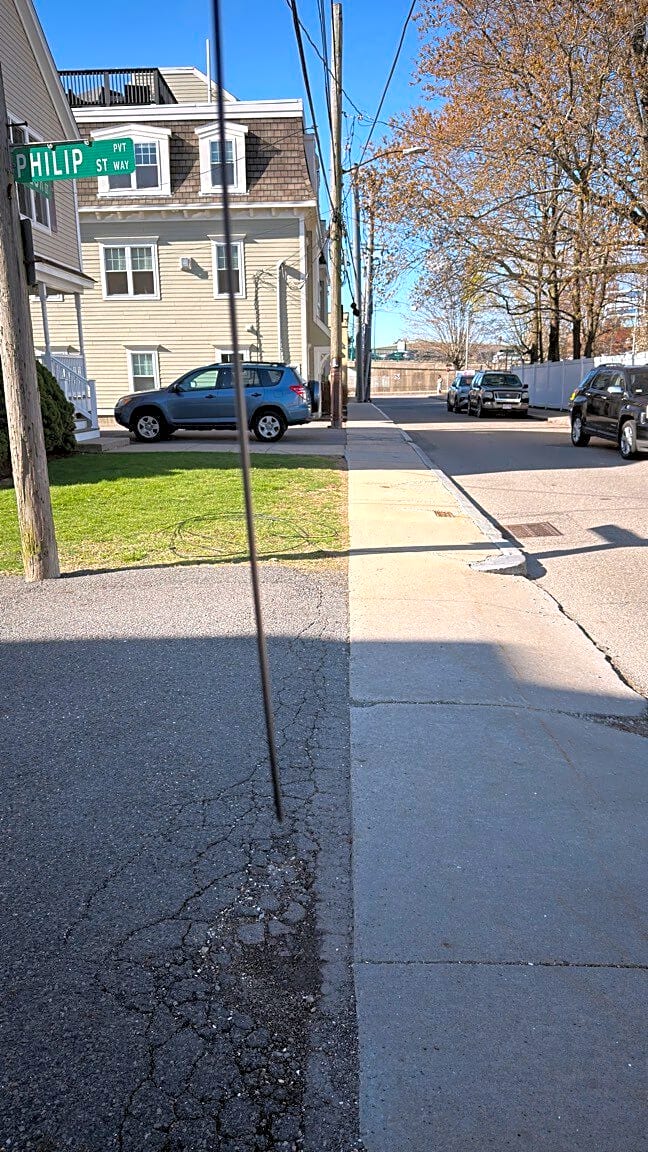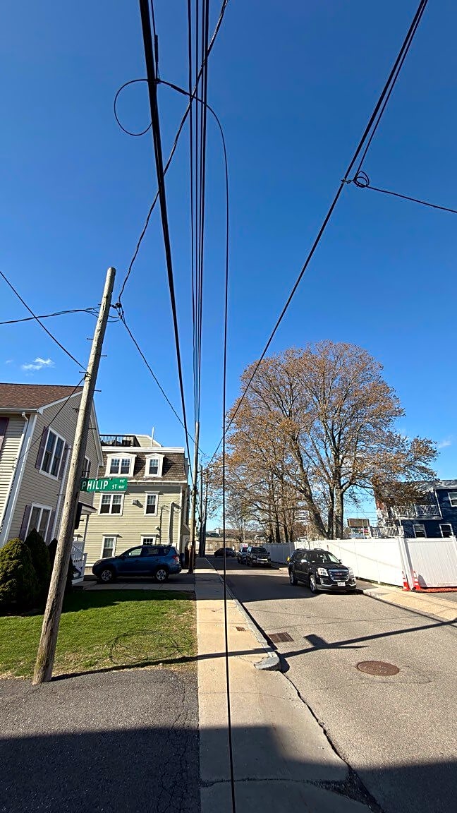 Intersection Of Philip St And Taylor St, Dorchester, MaFiber cable hanging off the telephone poles and electric cables over the sidewalk.