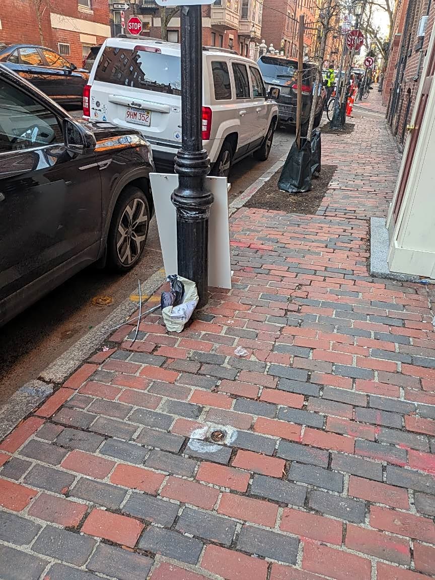116 Chestnut Ave, Jamaica Plain, Ma, 02130Public safety sign: [Yes] Type of sign: [BPD reports that a stop sign, No standing or stopping sign, one way sign and a street sign was knocked down in an MVA.] Is the pole still there: [Yes]
