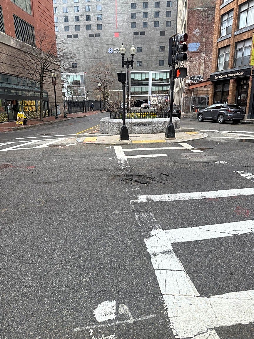 Intersection Of Bedford St And Kingston St, Boston, MaPothole on Kingston at crosswalk