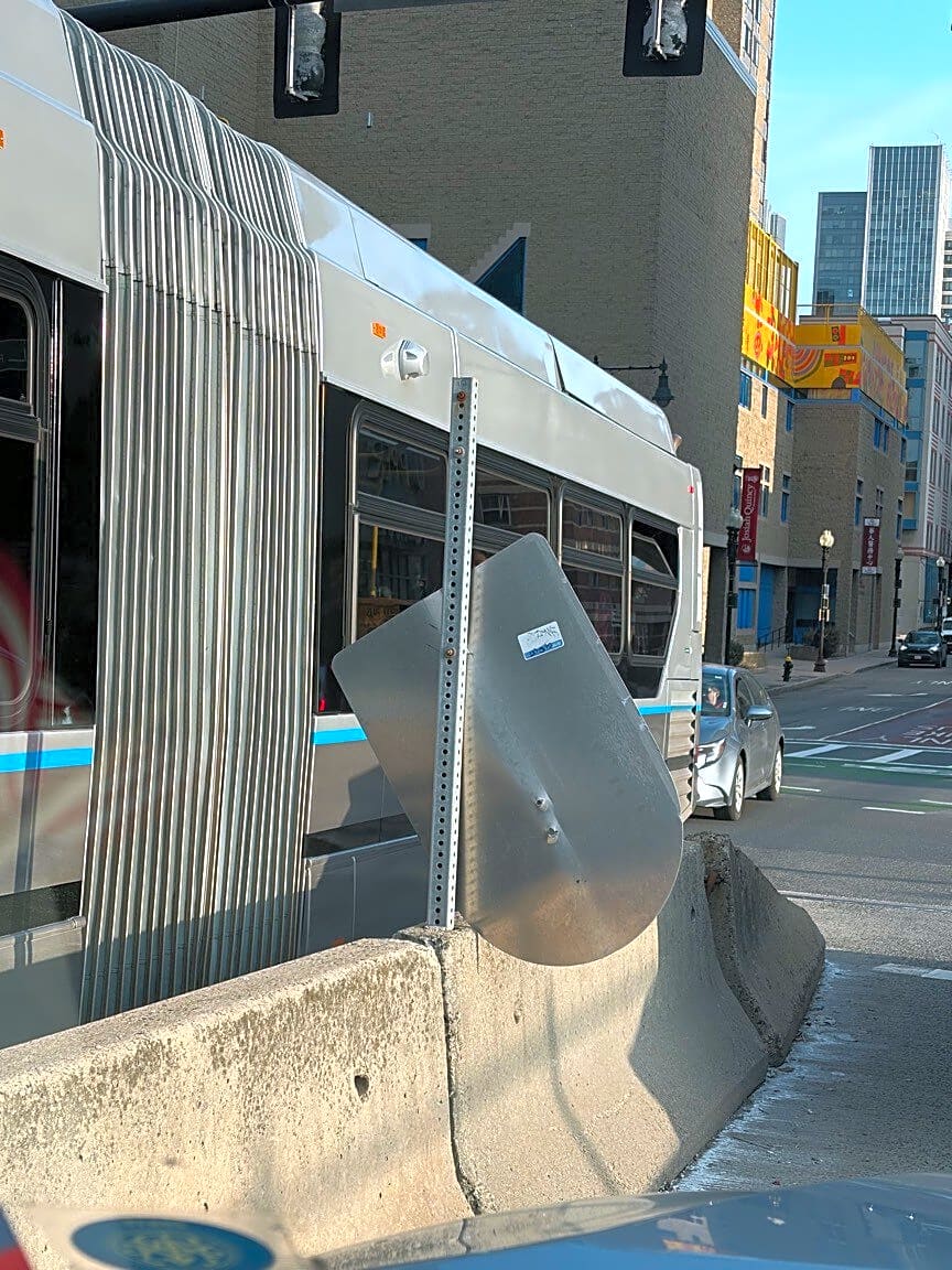 Intersection Of Marginal Rd And Washington St, Boston, MaFalling road sign (MBTA bus sliver lane) on Washington Street.