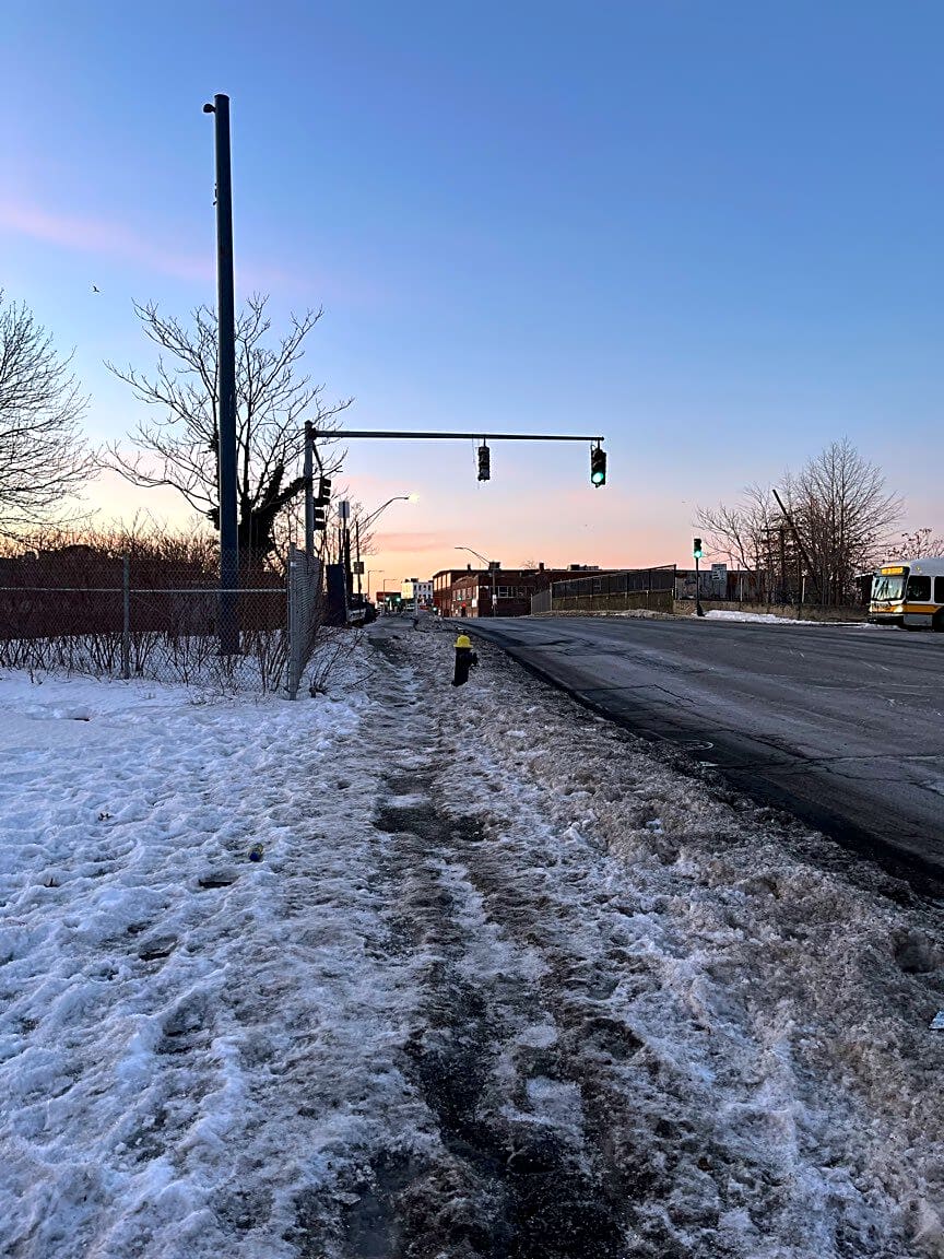 Intersection Of Dorchester Ave And Massport Haul Rd, South Boston, MaSnow and ice blocking sidewalk. Pedestrians are walking on the busy road instead causing a dangerous situation.
