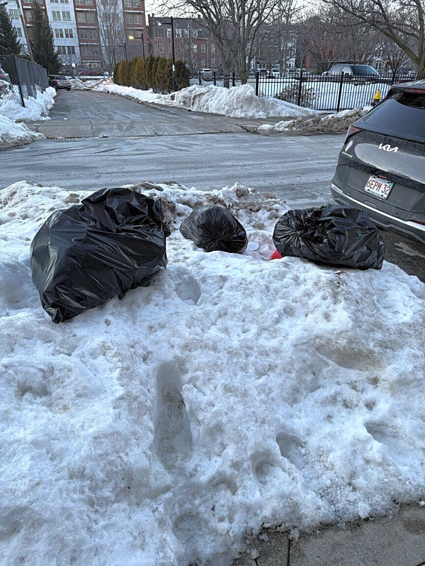 113 Orleans St, East Boston, Ma, 02128Residential trash in snowbank