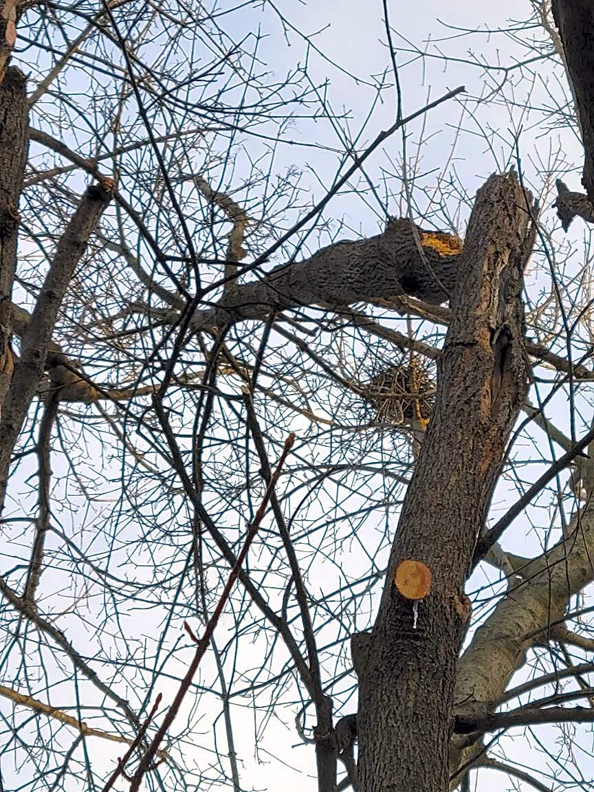 Alleghany St & Pontiac StTwo broken limbs above dead street tree (Pontiac St opp Alleghany St Alley) pointing at adjacent sidewalk.
