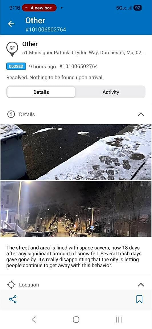 Well sure. If you come by at night, everyone is home, and parked in their saved spaces, with the savers on the sidewalk, or in their cars. The city residents as a whole would really benefit from a continued daytime removal of savers from the street, and the sidewalks. Thank you