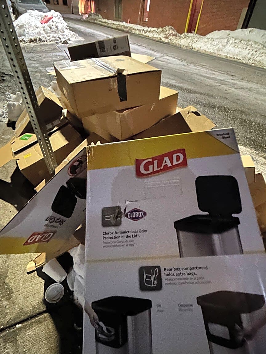15 21 Sleeper St, Boston, Ma, 02210Cardboard boxes, trash, still there on 3rd day, Sleeper St at parking lot by the alleyway…