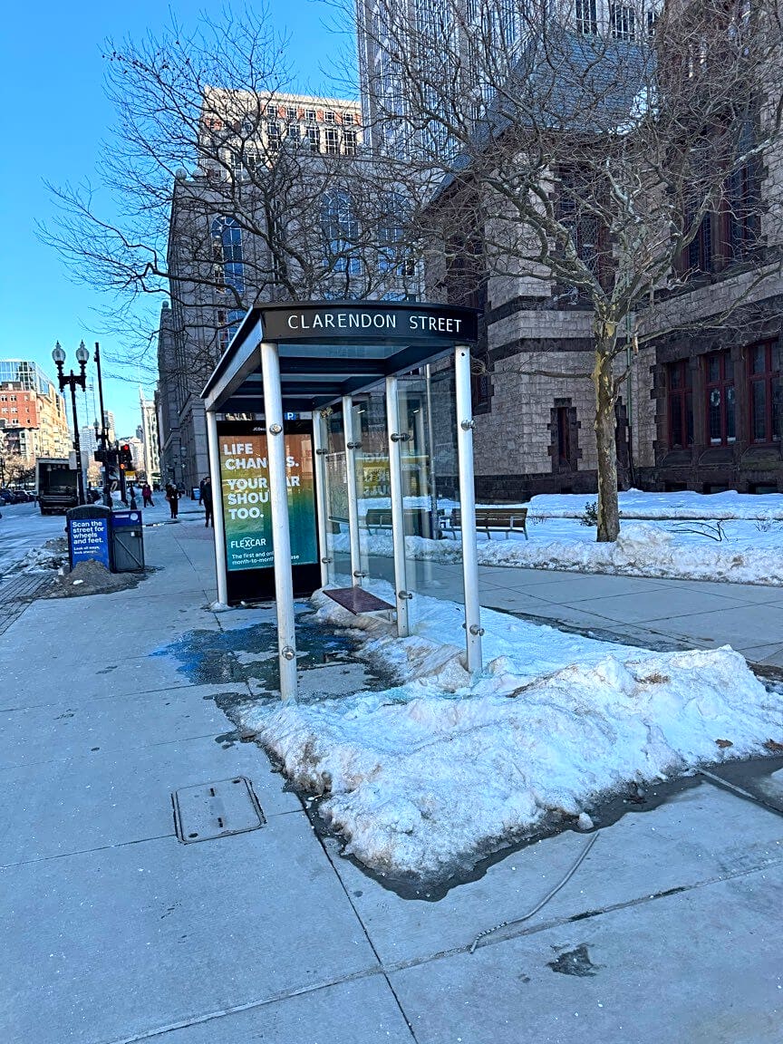 Intersection Of Clarendon St And Boylston St, Boston, MaShattered glass pane at bus stop, glass on sidewalk and snow