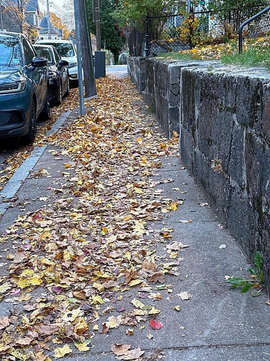 115 Chestnut Ave, Jamaica Plain, Ma, 02130Leaves on walkway. This gets very slippery when it rains or freezes. I have already tripped in this.