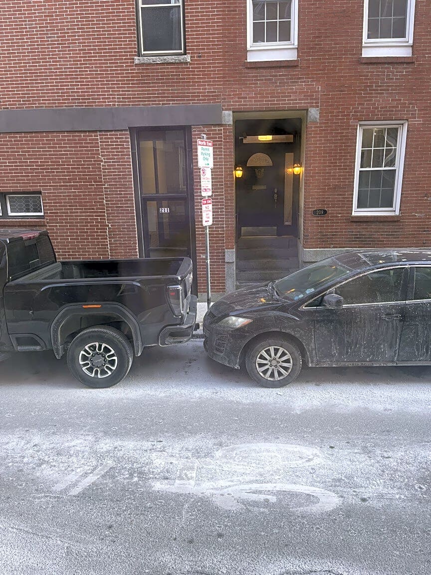 209 Salem St, Boston, Ma, 02113Large truck parking in illegal spot and also covering crosswalk. Salem and Charter . Significant safety concern for pedestrians or fire trucks