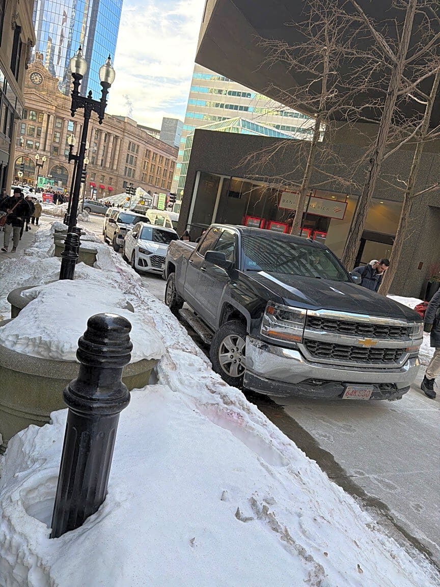 172 180 Federal St, Boston, Ma, 02110This is an accessibility issue that happens every day. Parking on a sidewalk is not ok