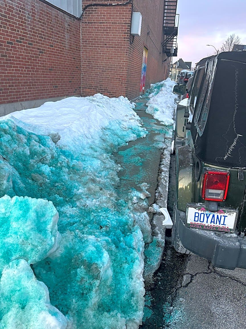 Who did this??? In lieu of actual snow removal, somebody sprayed ridiculous amounts off toxic ice melt around the Strand Theater. This is further reflection of the city’s negligence with snow removal, but this brings it to another level. Please explain.