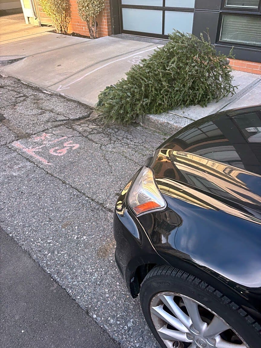 Christmas left on side walk since yesterday (Wednesday) it’s moving when windy, also could hit parked cars, when wind gets too howling. Trash pickup isn’t until Friday morning (due to holiday)