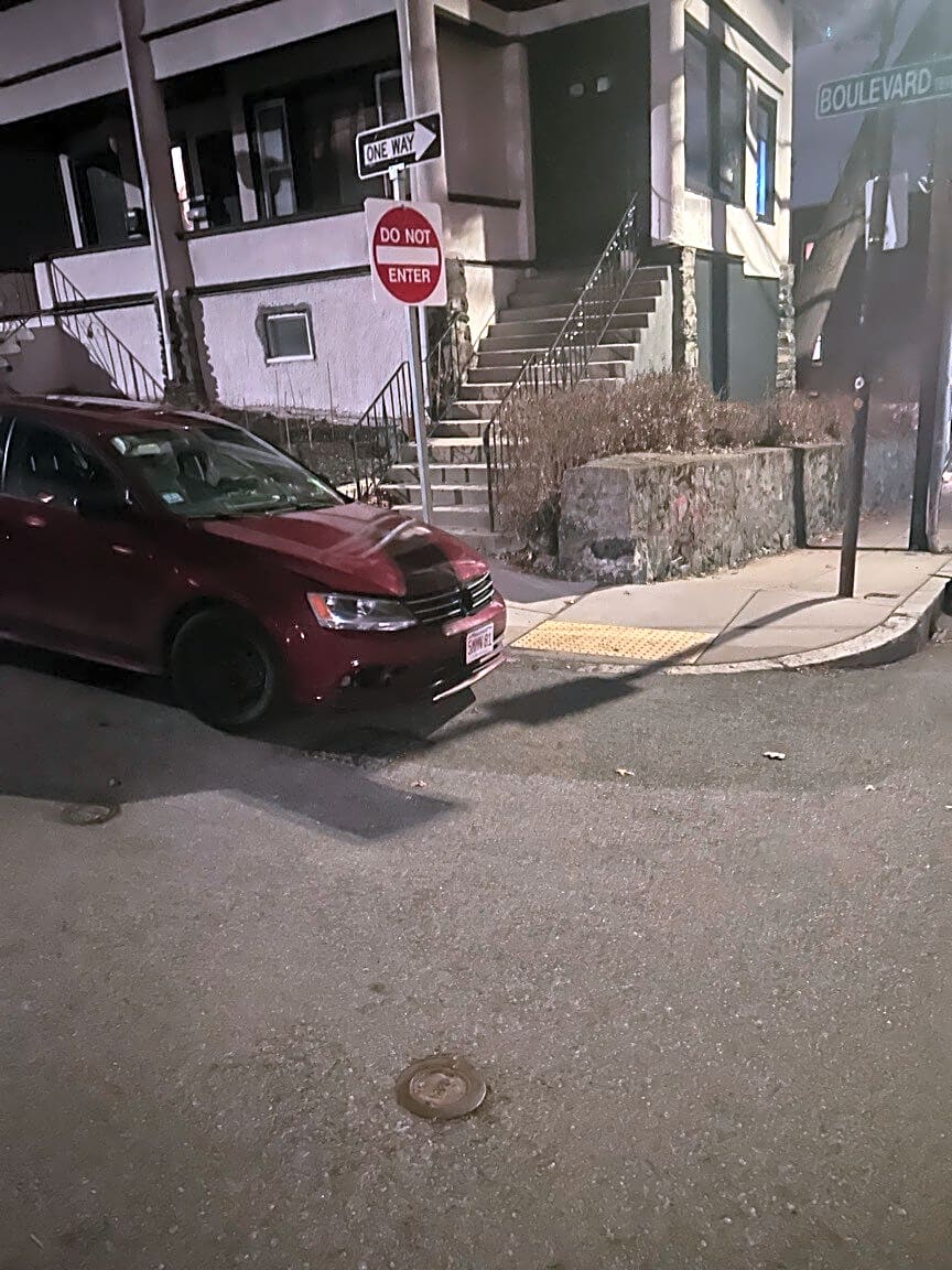 Intersection Of Leeds St And Woodward St, South Boston, MaCar illegally parked on sidewalk at corner of Woodward and Leeds LP# 6S9521