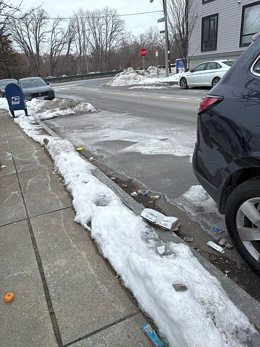 Intersection Of Soldiers Field Pl And Soldiers Field Rd, Brighton, MaTrash on street and sidewalk between corner with soldiers field rd and 15 soldiers field place