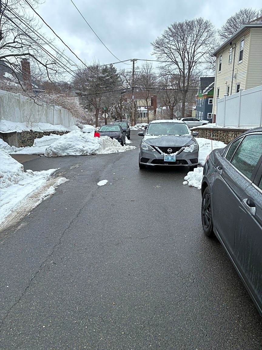 1 Maria Ln, Roslindale, Ma, 02131This car is parked in the middle of the street for 2 hours and blocking the driveway also 2 other cars are parked at the beginning of the street so cars / emergency vehicles can not get up the street . WTF is going on with the BTD . Can we get some help on this street ASAP.