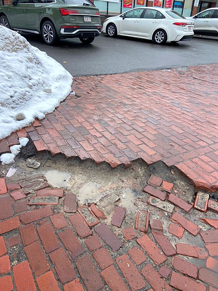 Intersection Of Church Ct And Main St, Charlestown, MaBrick Sidewalk washed out - impassable on crutches, wheelchair etc