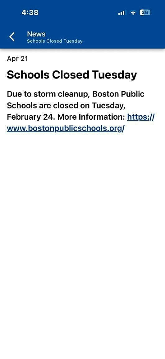 187 Warren Ave, Boston, Ma, 02116Suggestion to change the 311 Status of Services for April 21 about BPS closure so it reflects the correct information that does not have anything to do with snow removal.