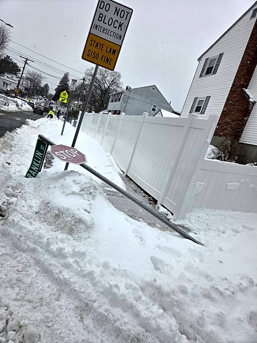 Intersection Of Franklin St And Sunnyside St, Hyde Park, MaStop sign blocking sidewalk next to elementary school