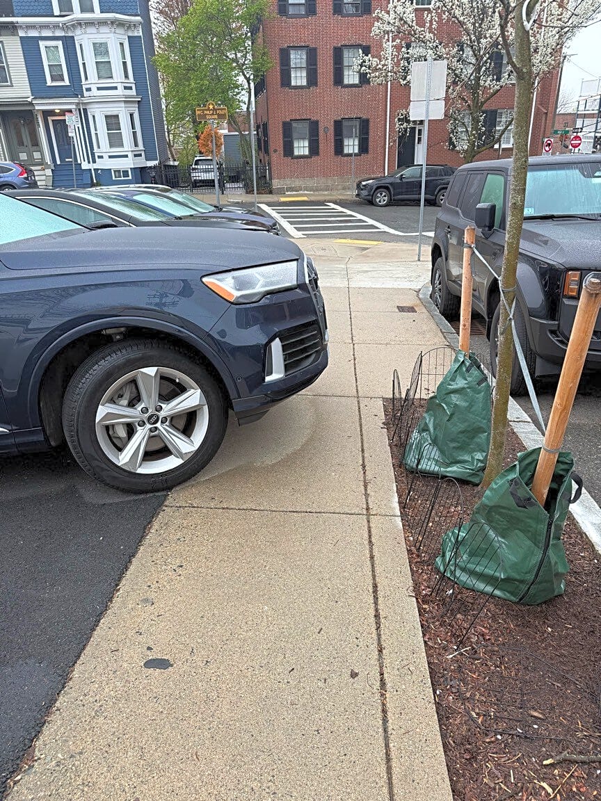 Intersection Of Pearl St And Wesley St, Charlestown, MaCar parked in school lot is blocking the sidewalk. They also have an expired inspection sticker (March 2026).