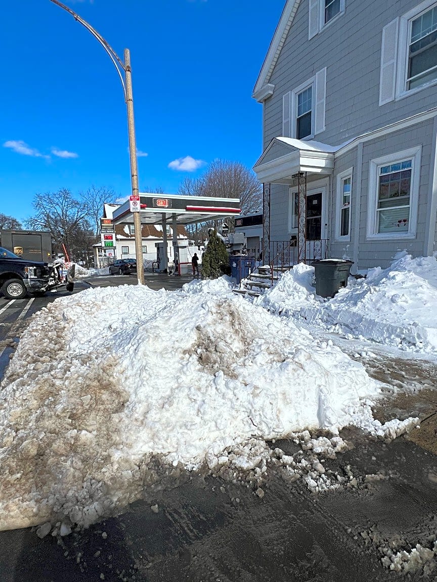 1454 Centre St, Roslindale, Ma, 02131Snow removal request. There is a large snowbank in front of my house where I normally park. I live next to a gas station and have two toddlers. It’s also blocking the way to the drain so ice is piling at the end of the driveway. Thank you.