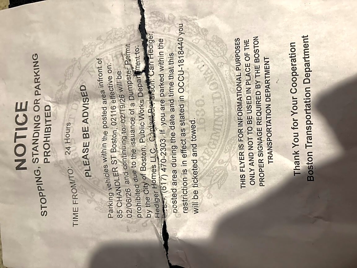 85 Chandler St, Boston, Ma, 02116No parking permit was not put up with 48 hours notice. It was put up with 24 hour notice. Sign was put up today 2/5/26, with effective date 2/6.