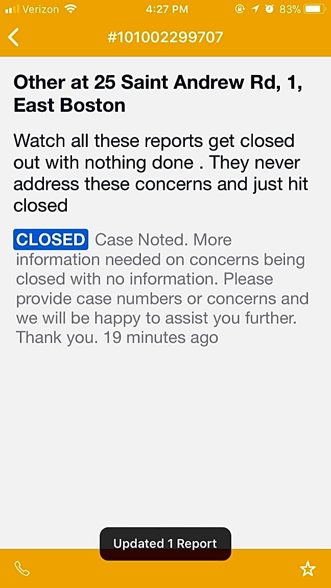 - Exactly my point cases just get closed out St Andrew Rd in East Boston has PF Barone plowing street . They are plowing in driveways and INTENTIONALLY piling snow where residents have already shoveled. When the resident asks them to stop the driver laughs at them and continues to make pile bigger . Calling 311 the customer service rep said there is nothing that can be done . Need more information it's a yellow plow license plate S95927. Need more information???? Or will this be closed out with nothing done ?