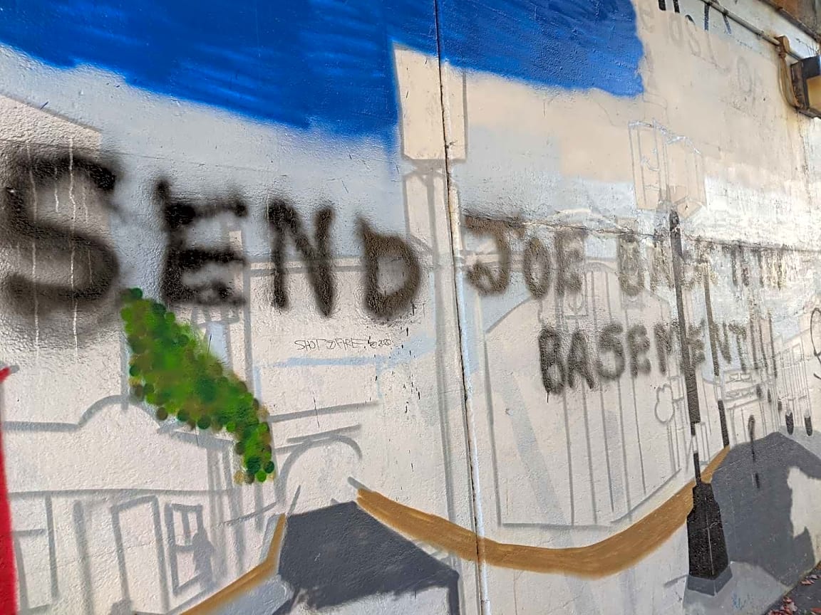 - "Send Joe Back to the Basement" on mural under the T bridge. Perhaps get Dorchester Art Project to help repaint? | Offensive: Yes | Case (SR) Type: [MBTA] Referred To: [MBTA]