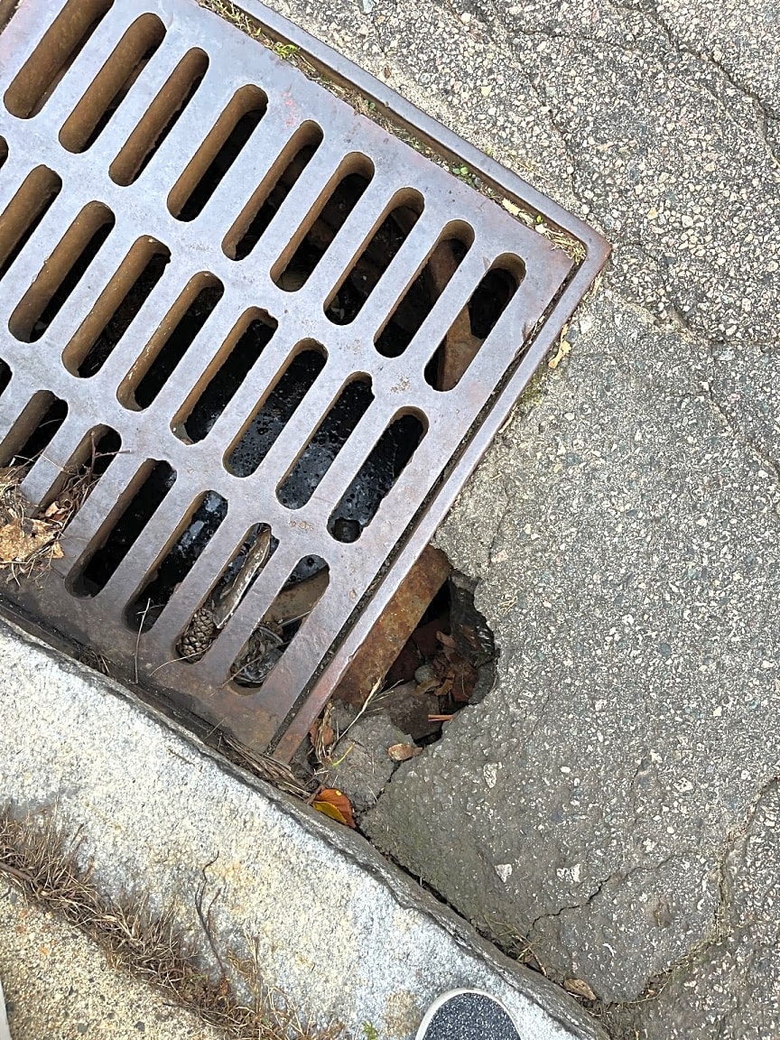 - Asphalt around storm drain opened up. Risk to dogs and small children falling into storm drain.