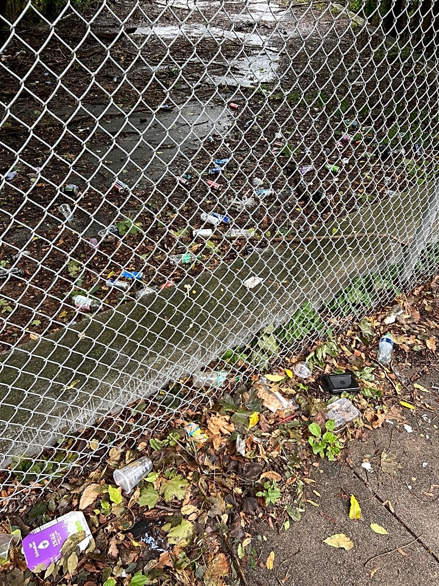 - Trash at fence above red line on Park St