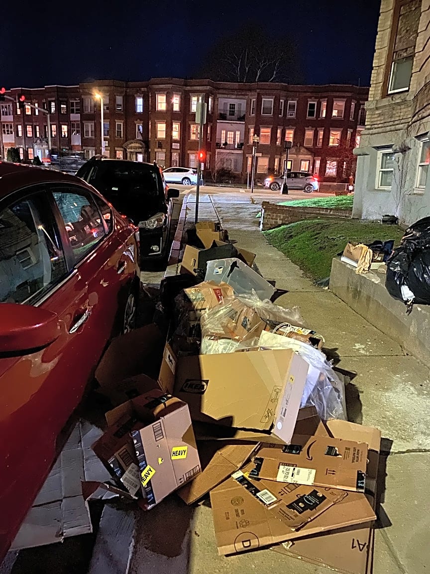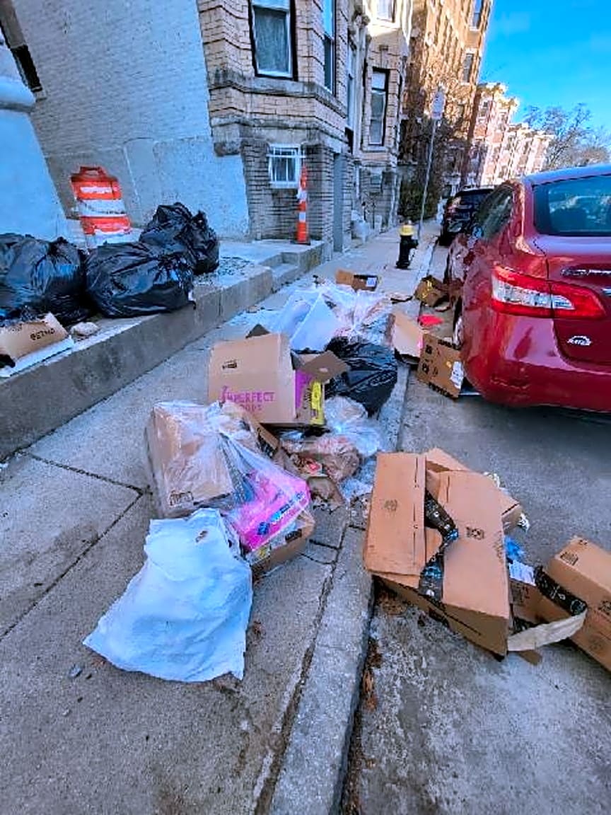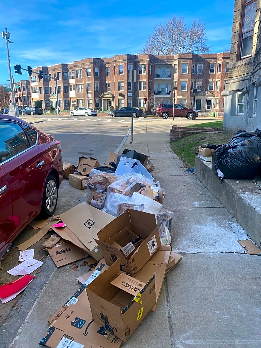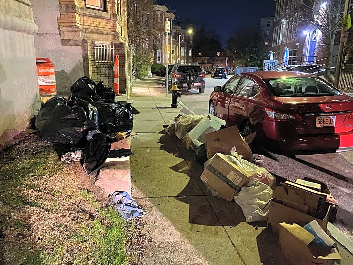 - There’s a huge heap of trash and/or recycling on the sidewalk and spilling out to the street.