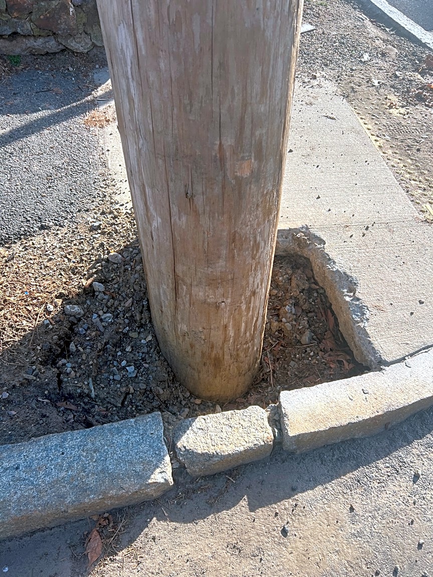 - A toe amount of the top sidewalk fill around a new telephone pole washed away in the last storm.