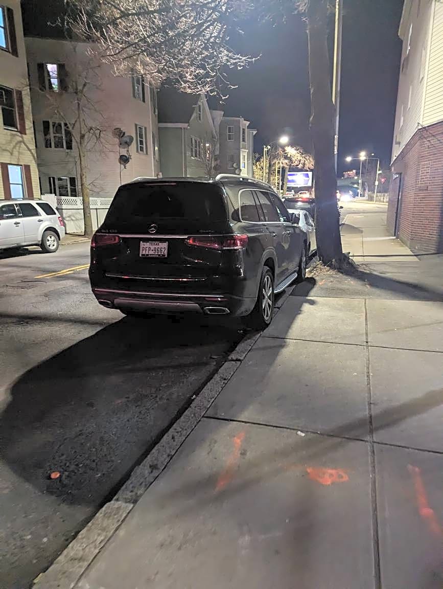 - Black BMW SUV with Texas plates parked with wheels up on the sidewalk on Saratoga St near Neptune Rd in East Boston