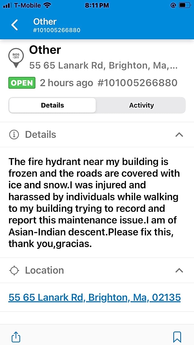 - 55-65 Lanark Stop wasting 311 time there are thousands of illegals who want these services....(FROZEN FIRE HYDRENT) | Case (SR) Type: [Fire Department Issues] Referred To: [FIRE DEPARTMENT]
