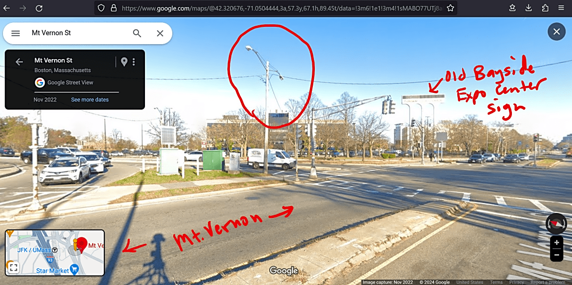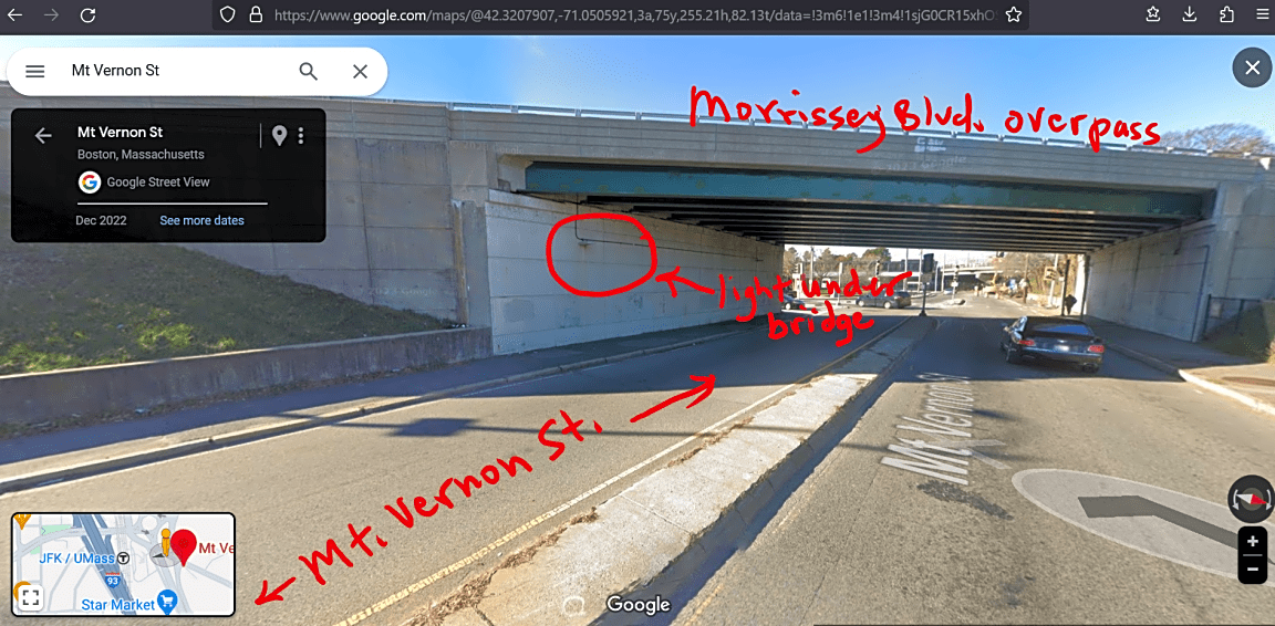 - Several lights out on Mt. Vernon St. in Dorchester, between the JFK Red Line station and the Harbor Point apartments. -Intersection of Mt. Vernon and the Morrissey Blvd. off-ramp (42.32056833585751, -71.05029493425391): *SW corner: 1 sodium light out *Pole 1823, sodium light out *NW corner: 2 sodium lights out (on one pole) -On Mount Vernon St. under the Morrissey Blvd. overpass: Wall-mounted LED light out. -On Mt. Vernon St. across from the entrance to Harbor Point and next to the NW corner of the McCormack school building (42.3183678055261, -71.04396185390591). LED light out. No emergency, but these would help with pedestrian safety. Thank you!
