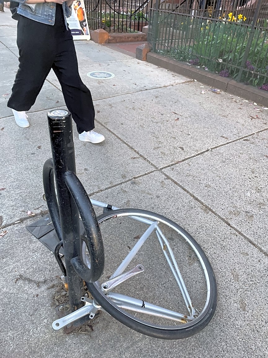- Abandoned bike parts locked on sidewalk at 281 Newbury St — major tripping hazard. Thanks for removing.