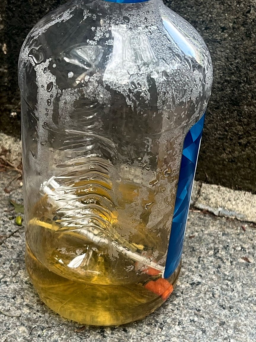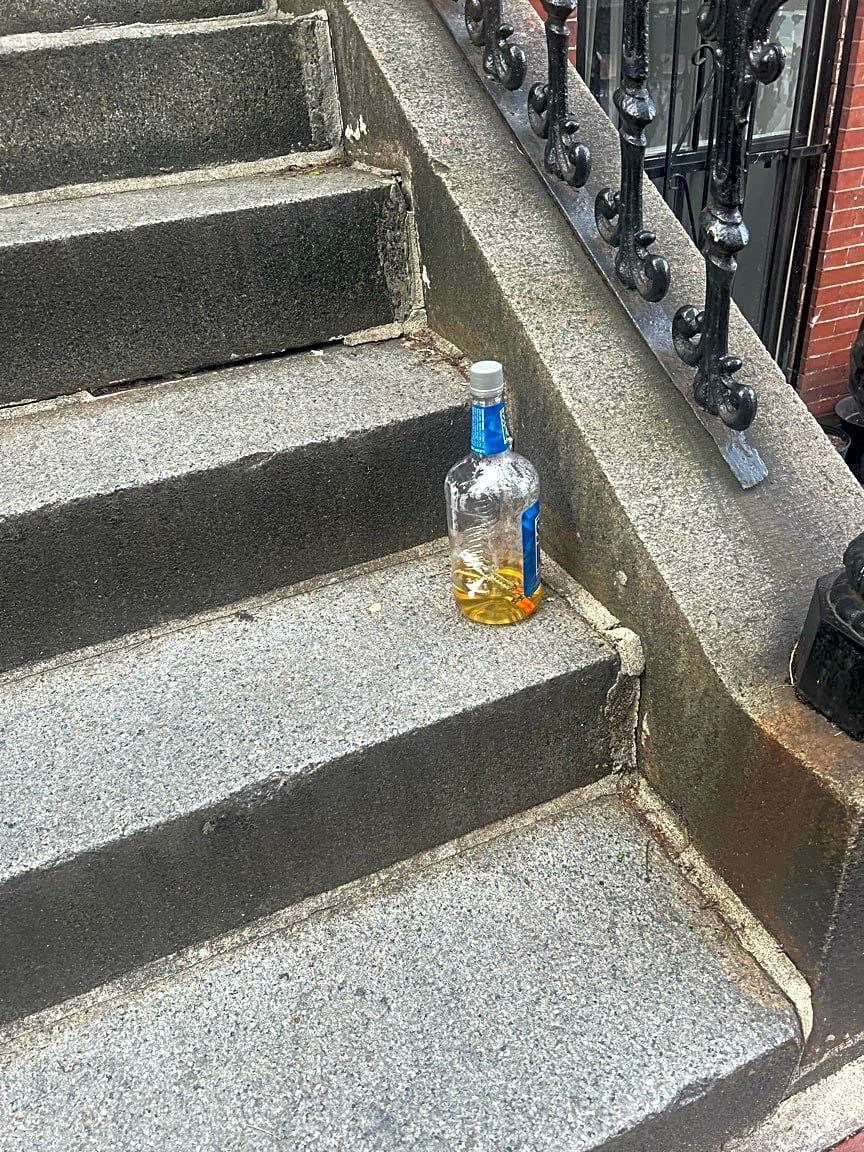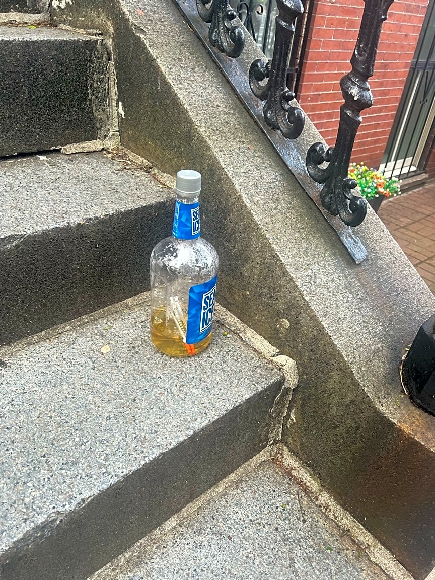 - Vodka bottle full of piss and 4 needles on my doorstep