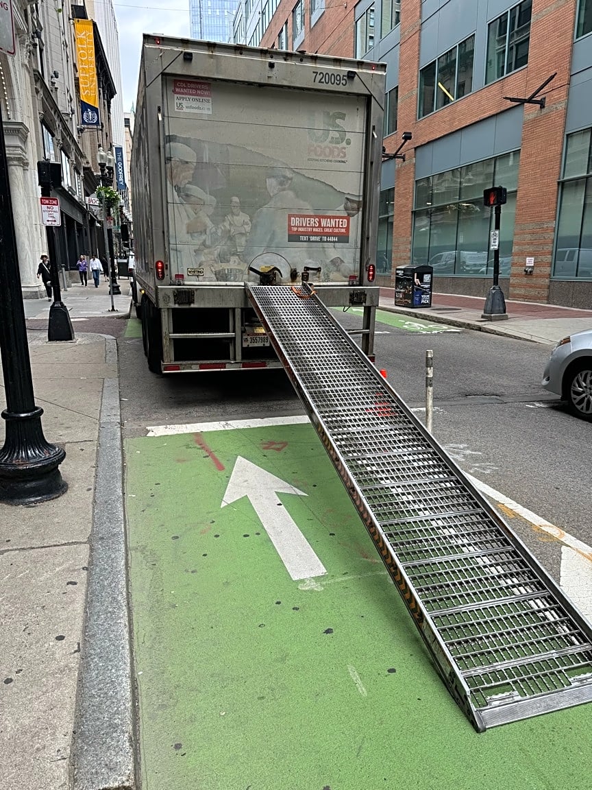 - Truck parked in bike lane and bike turn box, with rap in the bike lane. No detour or traffic management. Also parked across crosswalk and blocking the ped signal