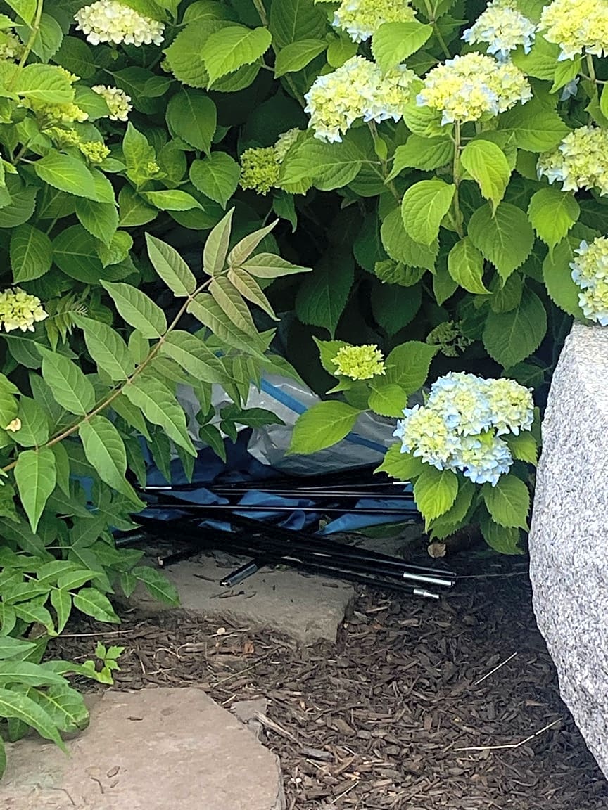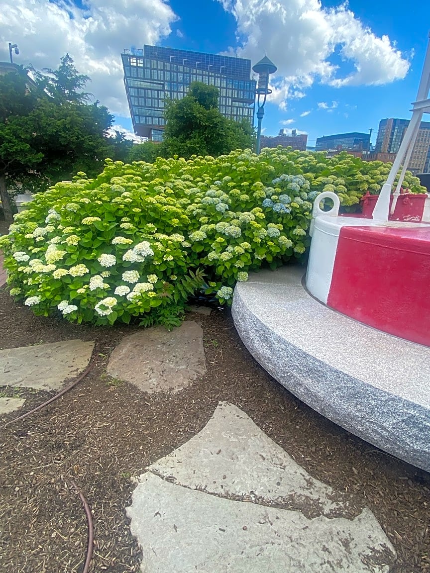 - Trash under flower bush in park along the harbor walk (Binford st)