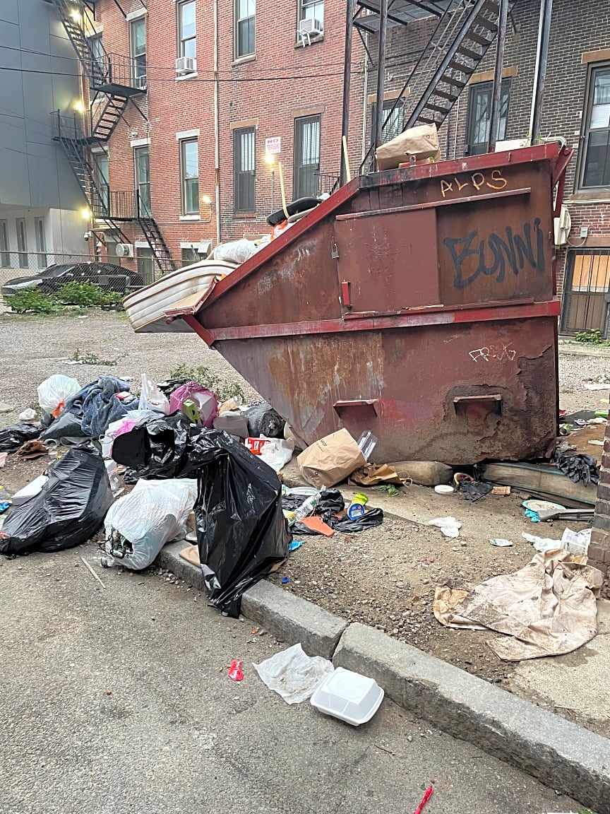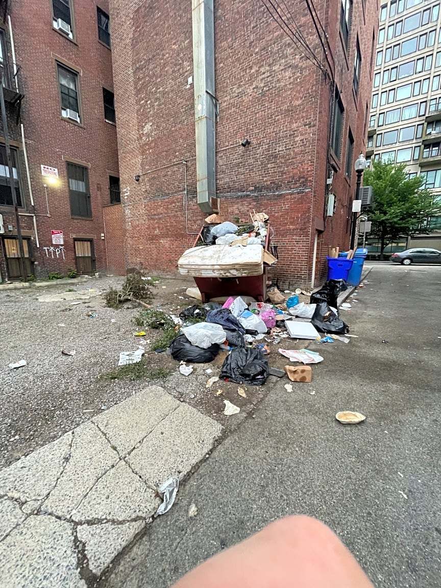 - Behind the building of 700 Mass Ave. old mattress, trash has been dug through. Been like this for over 2 weeks and continues to get worse. Also needles are seen.