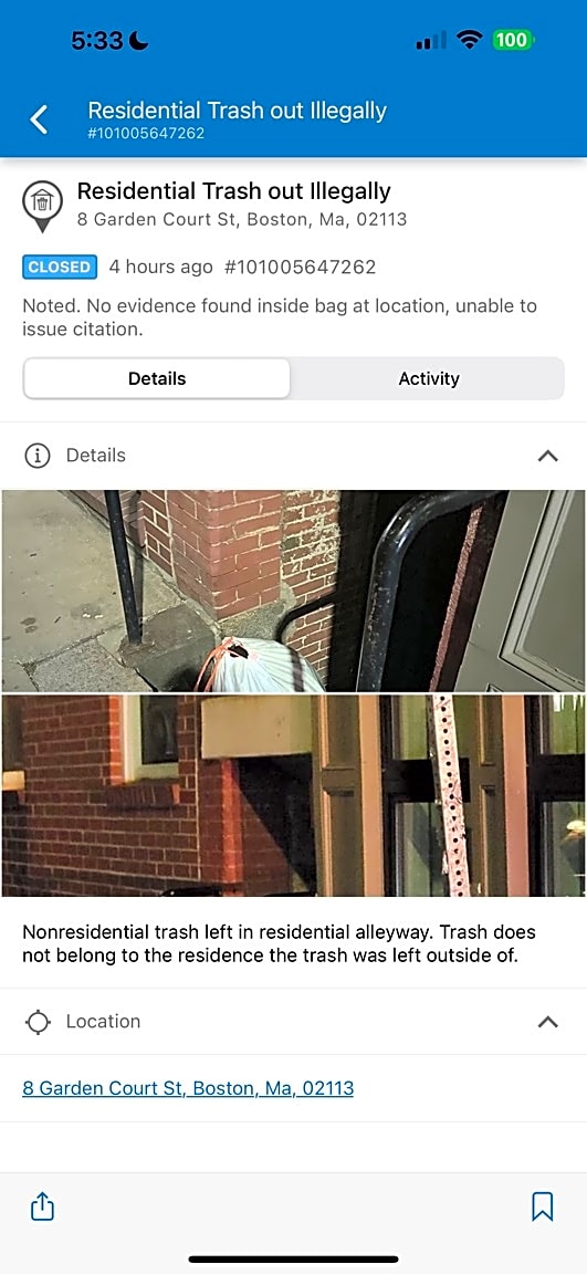 - Litter. Please PICK UP the trash bag left outside my residence, as I filed a report yesterday & you came to check it out, took a photo of it, couldn’t find evidence of its owner inside the bag, but still left it sitting there!? Our neighborhood is covered in filth and you drove by, took a photo & left it there? Do better!