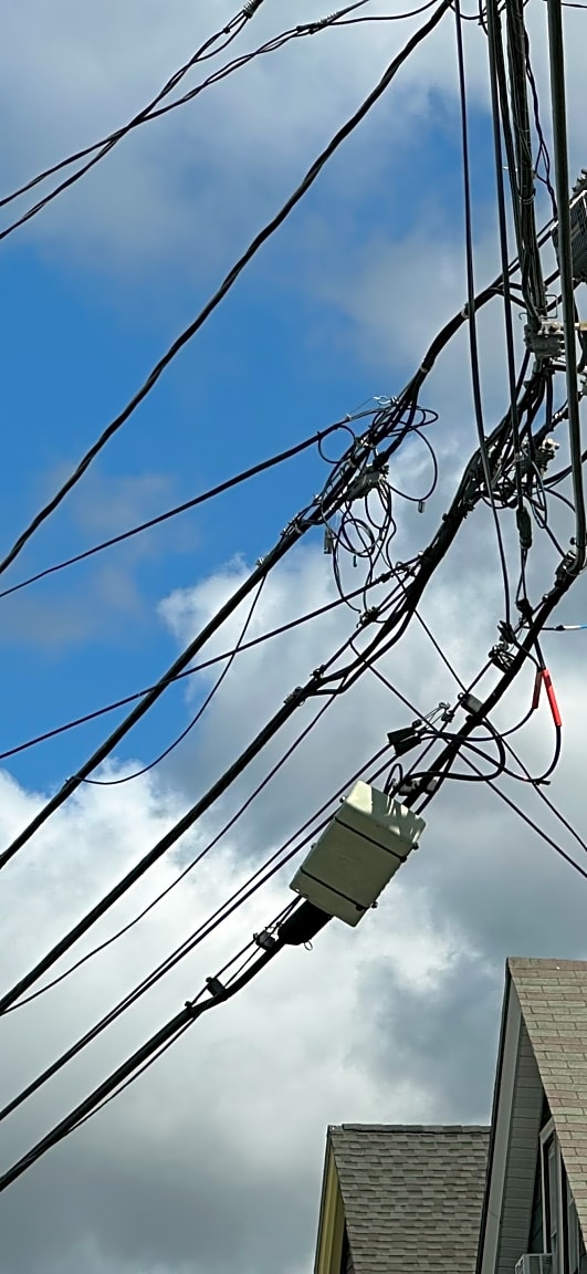 - Hello. Between all of the utilities, it is taken 2 1/2 years to replace this broken pole and remove the old one. As you can see from this picture, the communications company with the wiring on the bottom row did not properly move their box from the old pole to the new pole. They simply took the junction box and tie, wrapped it to the existing cables, creating an high sore and further blighting in the area. Is it possible for whomever is in charge of quality control to properly mouth this box off of the hanging wire and onto the pole? The job would finally be complete The first two photos show how it’s done, and The third photo shows how it is on every other pole in the neighborhood, box mount to the pole, not blocking the view from the porch. :-) | Case (SR) Type: [Cable/Telephone/Broadband Issues] Referred To: [Broadband and Cable Office]