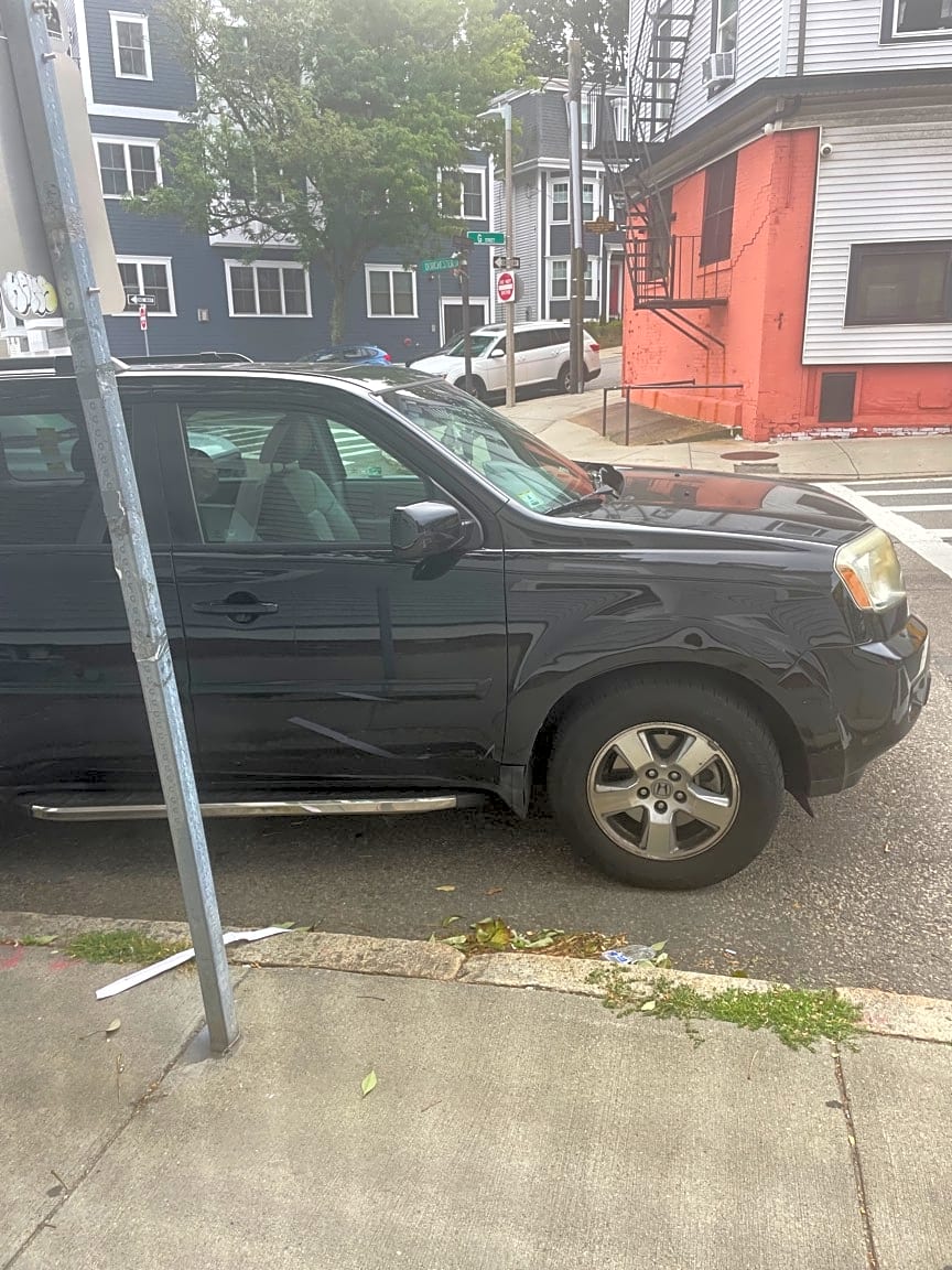 - Car not allowed to park infront of sign. Creates a dangerous intersection.