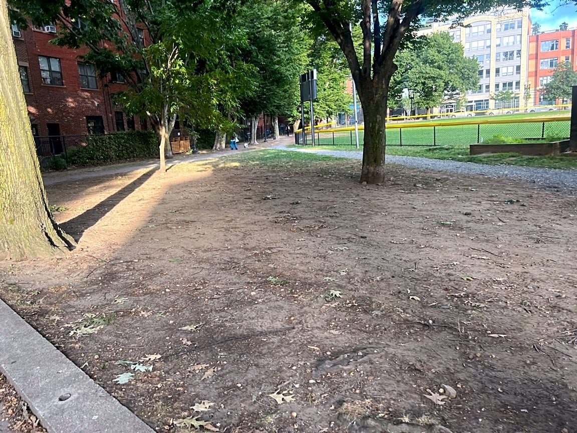 - Construction equipment ruined grass in Peter’s Park. Grass needs to be reseeded.